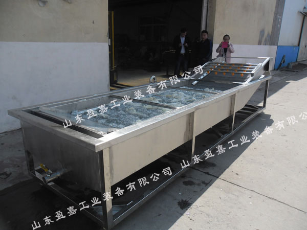 2、盈嘉全自動氣泡蔬菜清洗機設(shè)備中設(shè)有氣泡發(fā)生裝置,使物料呈翻滾狀態(tài),去除產(chǎn)品表面農(nóng)殘功效,同時可加入適量的藥劑,進行消毒固色,漂浮物可以從溢流槽溢出,沉淀物從口排出,以達到清洗的目的。 輔機池為沉淀池,內(nèi)設(shè)有抽水水泵,循環(huán)主機池的水,泥土類贓物由此機沉淀、清除。