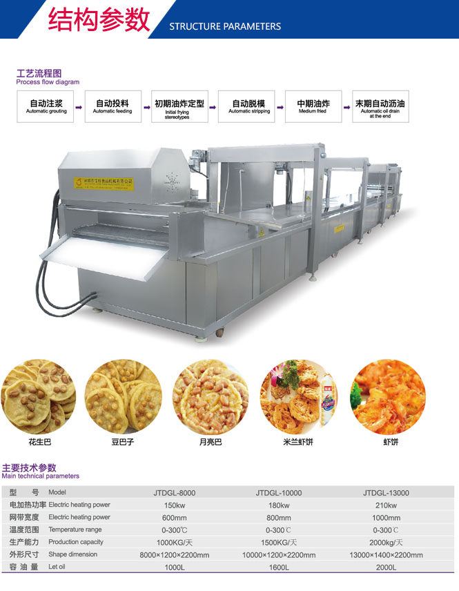 月亮巴、花生巴、豆巴、米蘭蝦餅等在江西一代比較流行,相比較而言對(duì)油炸加工月亮巴等產(chǎn)品的油炸機(jī)需求量也是比較大的,山東盈嘉作為較早從業(yè)油炸行業(yè)的廠家,結(jié)合多家月亮巴食品廠家的油炸經(jīng)驗(yàn)以及工藝要求,特推出該款月亮巴/花生巴/米蘭蝦餅電腦全自動(dòng)油炸流水線,該款設(shè)備是在原先的基礎(chǔ)上進(jìn)行了改革創(chuàng)新,人性化的設(shè)計(jì)理念使該款油炸機(jī)更適合花生巴、豆巴子等產(chǎn)品的油炸加工,實(shí)現(xiàn)了從自動(dòng)注漿--自動(dòng)投料--初期油炸定型--自動(dòng)脫模--中期油炸--末期自動(dòng)瀝油的一體化生產(chǎn)過(guò)程,全程實(shí)行電腦全自動(dòng)控制,所有程序都可通過(guò)觸摸式操作進(jìn)行有效控制,操作起來(lái)簡(jiǎn)單方便,大大提高了生產(chǎn)效率。溫控有全電腦控制觸摸屏設(shè)定和智能溫控儀兩種方式,溫度可控誤差在上下1度左右。