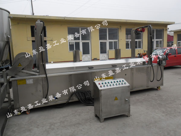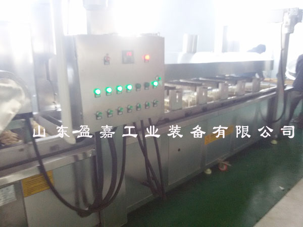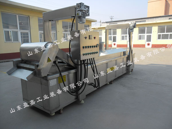 盈嘉油幕式炸豆腐串油炸流水線通過對(duì)食用油直接加熱,對(duì)油溫直接控制,對(duì)各種油炸工藝都能比較好的調(diào)節(jié),物料在網(wǎng)帶上移動(dòng)過程中與油幕流下的熱油充分接觸,通過網(wǎng)帶的移動(dòng)帶動(dòng)物料前進(jìn)。由于設(shè)備效率高,生產(chǎn)出的產(chǎn)品質(zhì)量好,提高了產(chǎn)品的出品率,油炸過程中實(shí)現(xiàn)不間斷的過濾,避免了傳統(tǒng)油炸過程中產(chǎn)生的殘?jiān)鼩埩粼诋a(chǎn)品表面的現(xiàn)象,提高產(chǎn)品的合格率,高達(dá)百分之九十九,產(chǎn)品產(chǎn)量大大提高。